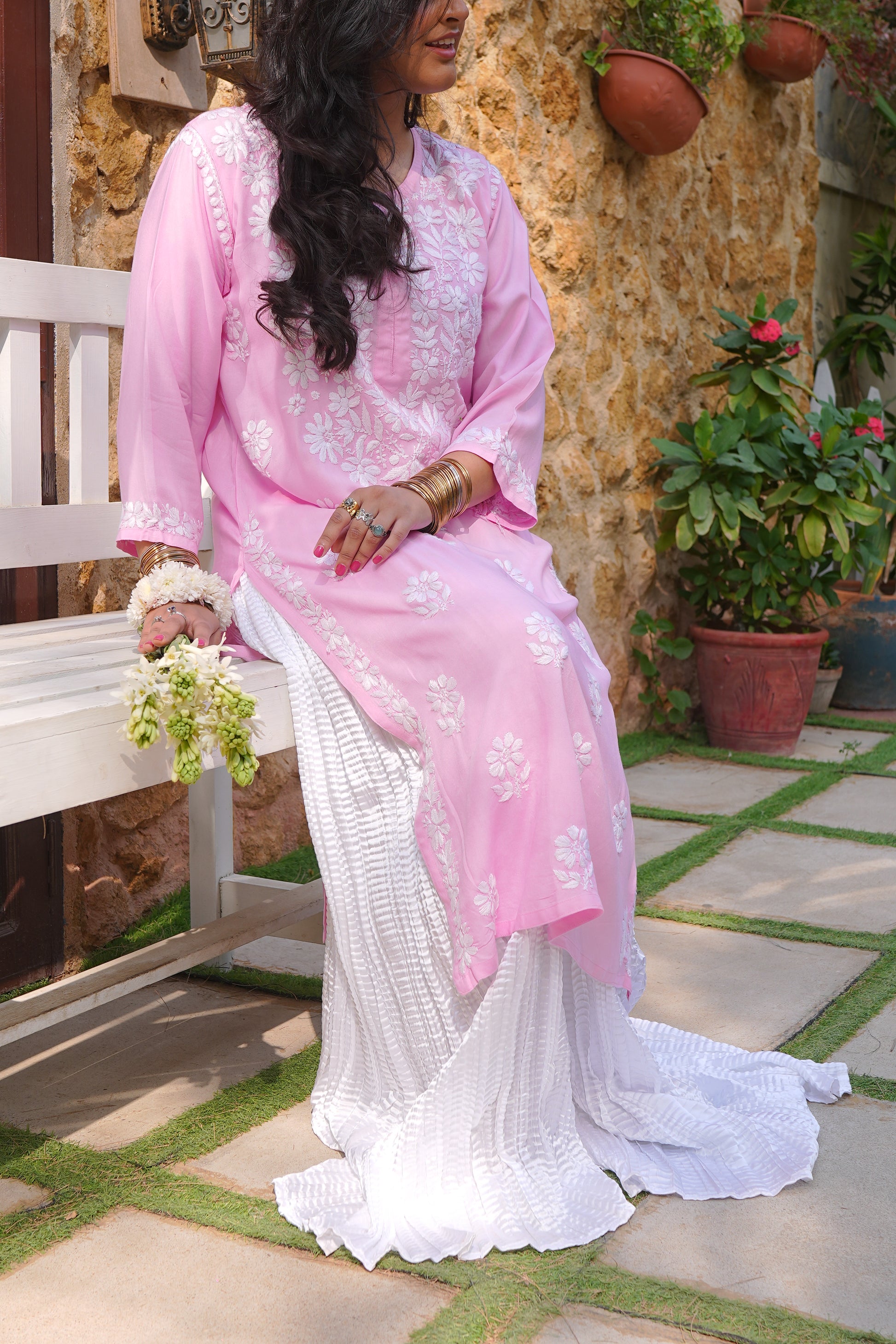 Soft ‘gulabi’ pink scattered with delicate white thread work — this is femininity in its most graceful form. Lightweight, breathable chikankari kurta is made to be worn from spring mornings to summer dinners effortlessly.