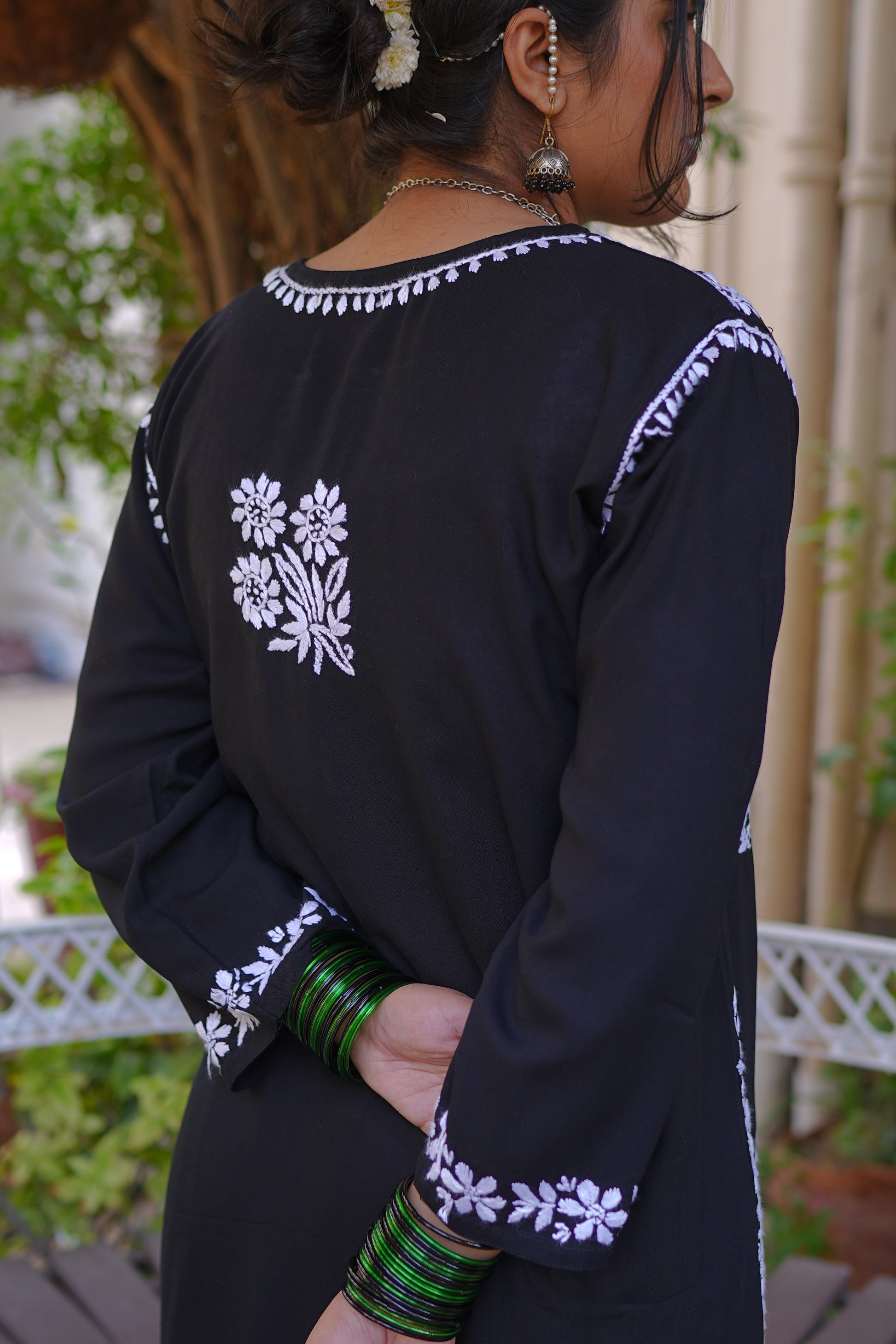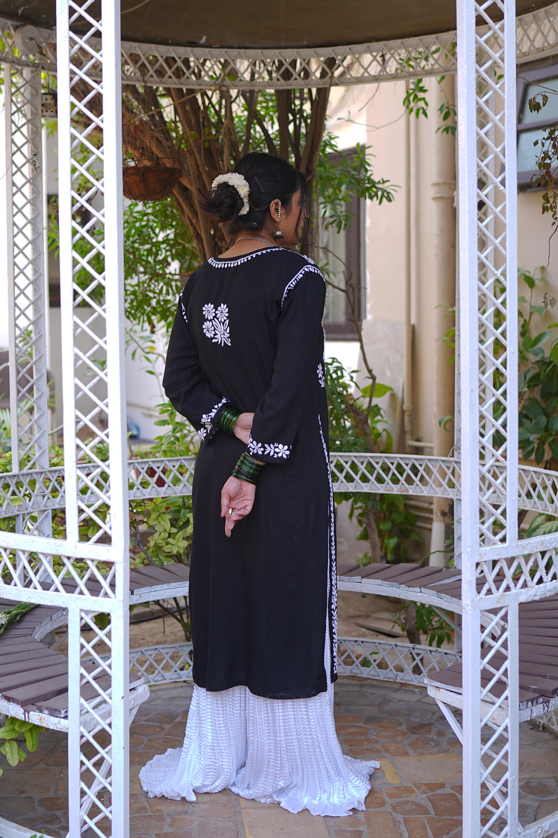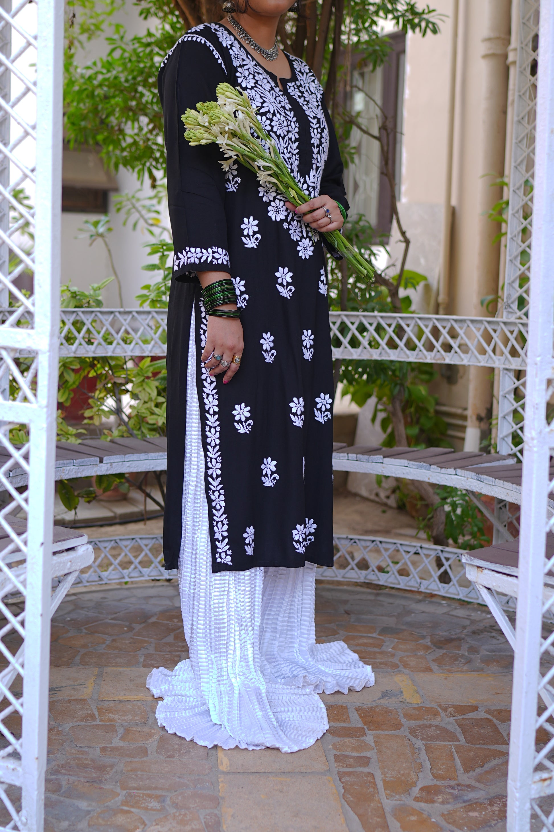 A bold timeless black base, detailed with crisp white hand-done chikankari florets.